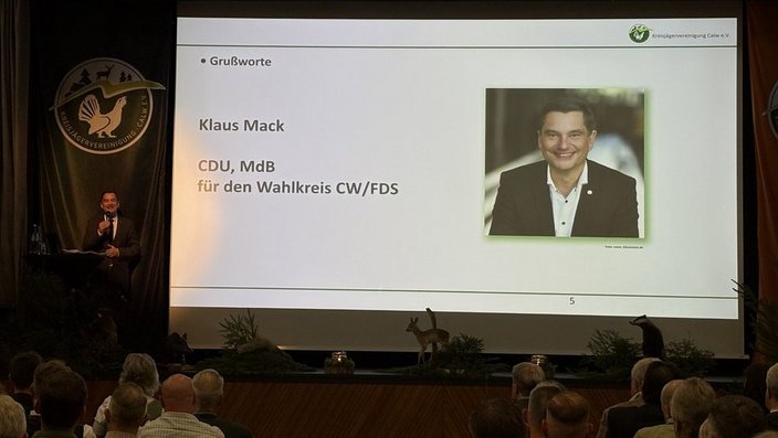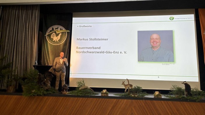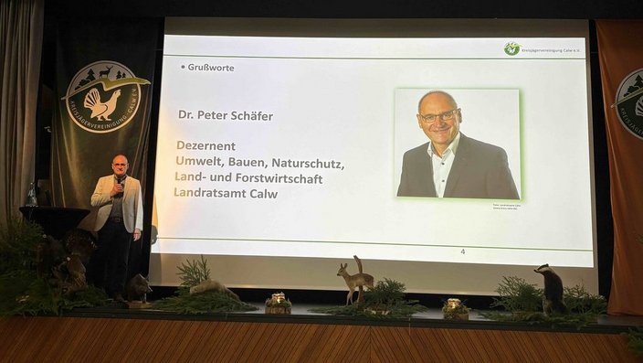 Bauen, Naturschutz sowie Land- und Forstwirtschaft des Landkreises Calw, Bundestagsabgeordneter Klaus Mack (CDU), Landtagsabgeordneter Carl Christian Hirsch (CDU), Daniela Steinrode (SPD), Bürgermeister Hagen Breitling aus Nagold, Markus Stollsteimer vom Bauernverband Nordschwarzwald-Gäu-Enz e. V., sowie Constanze Tenhaeff von ForstBW. In den Grußworten wurde die enge Zusammenarbeit zwischen Jägerschaft, Landwirtschaft und Behörden hervorgehoben. Dr. Peter Schäfer verwies konkret auf die gemeinsame prophylaktisch gegründete ASP-TaskForce zur Bekämpfung der Afrikanischen Schweinepest, die Betreuung von Konfiskatstellen und die Kitzrettung als Beispiele gelebter Kooperation. Bundestagsabgeordneter Klaus Mack betonte die Rolle der Jagdverbände als sachkundige Impulsgeber in der politischen Debatte und informierte über aktuelle Entwicklungen auf Bundesebene beim Thema Wolf. Ein Thema, bei dem nun die Länder gefordert seien, praktikable Lösungen zu erarbeiten.