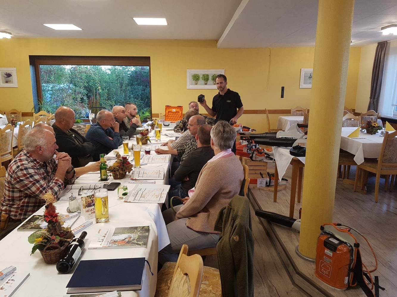 Philipp Dengler von der Firma DENGLER Land- und Haustechnik informierte die Anwesenden über Akku-Motorsägen und Kombigeräte als praktische Helfer für die Revierarbeit. Die Geräte konnten außerdem direkt vor Ort getestet werden. Auf einen kurzen Bericht von KJM Elke Marko und HRL Fabian Müller zu aktuellen Entwicklungen in der KJV und dem Hegering folgte ein geselliger Abend mit spannenden Gesprächen.
