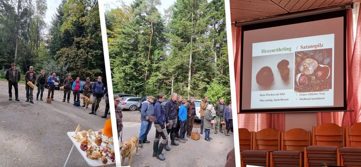 Am 12.10.2024 lud Monika Schulz wieder zu einem Pilzspaziergang ein. Bei herbstlichem Himmel und ebensolchen Temperaturen machten sich interessierte Anfänger und altbewährte Pilzsammler auf, um im Beinberger Wald nach Pilzen zu suchen und ihre Kenntnisse aufzufrischen bzw. Neue zu erlangen. Man traf sich am Rohrbrunnenparkplatz, erwartungsvoll, mit Pilzmesser und Korb ausgestattet. Bereits am Vormittag hatten Monika Schulz und Dr. rer. nat. Klaus Bsonek, Apotheker sowie geprüfter Pilzsachverständiger der Deutschen Gesellschaft für Mykologie (DGfM), zahlreiche interessante Pilze gesammelt, um sie den Interessierten ausführlich erläutern zu können.