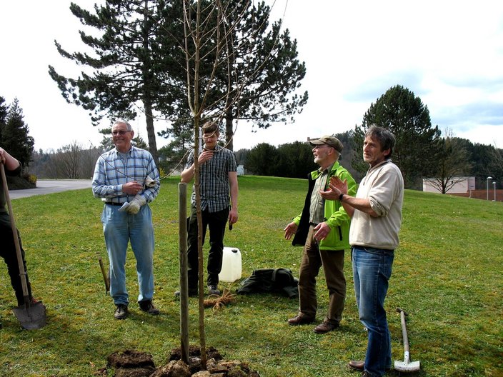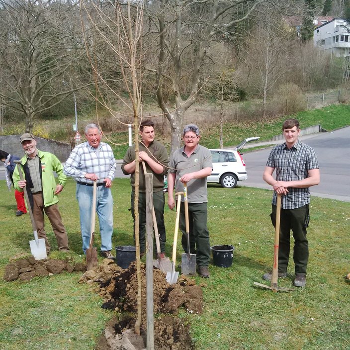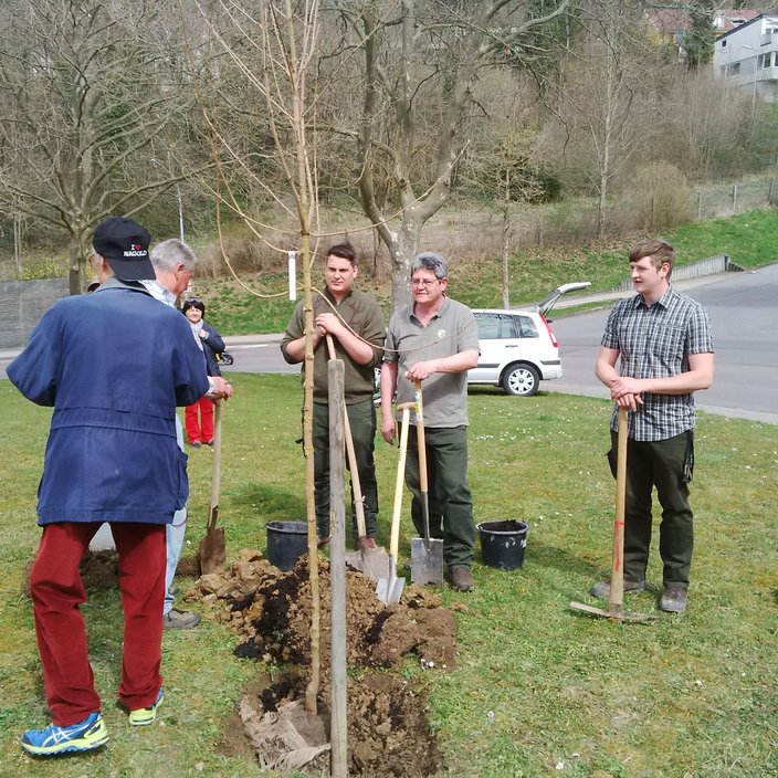 Nagold. Nach der Elsbeere und dem Wildapfel pflanzte die Arbeitsgemeinschaft Natur- und Umweltschutz (ANU) Nagold mit dem Feld-Ahorn den dritten Baum des Jahres auf Nagolder Gemarkung. Peter Widmann-Rau, Umweltbeauftragter der Stadt Nagold, betonte beim Aushub des Pflanzlochs auf der Wiesenfläche hinter dem Bahnhalterpunkt Steinberg, dass Oberbürgermeister Jürgen Großmann dem Akt gerne beigewohnt hätte, aber andere wichtige Termine das verhinderten. Das wäre ihm deshalb schon wichtig gewesen, weil hier mit dem Setzen des Feld-Ahorns als Baum des Jahres 2015 der Start für die Anlage einer "Jahresbaumwiese" gegeben wurde. Der Sprecher der ANU Nagold, Dieter Laquai, bedankte sich bei allen Helfern, die mit Spaten, Schaufeln und Pickel, im wahrlich steinigen Boden des Steinbergs das Pflanzloch vorbereitet hatten. Sein besonderer Dank galt Achim Häfele als Initiator und den Jägern des Hegerings 8, die auch dieses Mal wieder, den Baum des Jahres stifteten. Norbert Kiefer erklärte, dass es für die Jäger eine Selbstverständlichkeit sei, bei der Pflanzung des Baum des Jahres mitzuwirken und fast schon eine Ehre, jeweils den Baum zur Verfügung zu stellen. Mit einem passenden Gedicht wurde der etwa 3,50 Meter große Feld-Ahorn zusammen mit Humus eingebracht und gewässert. Damit dieser Baum auch als Neupflanzung nach der ersten Kurve der Gäurandsteige wahrgenommen wird, hat ihn Hans-Jürgen Schmidt mit einer grün-weißen Schleife versehen.