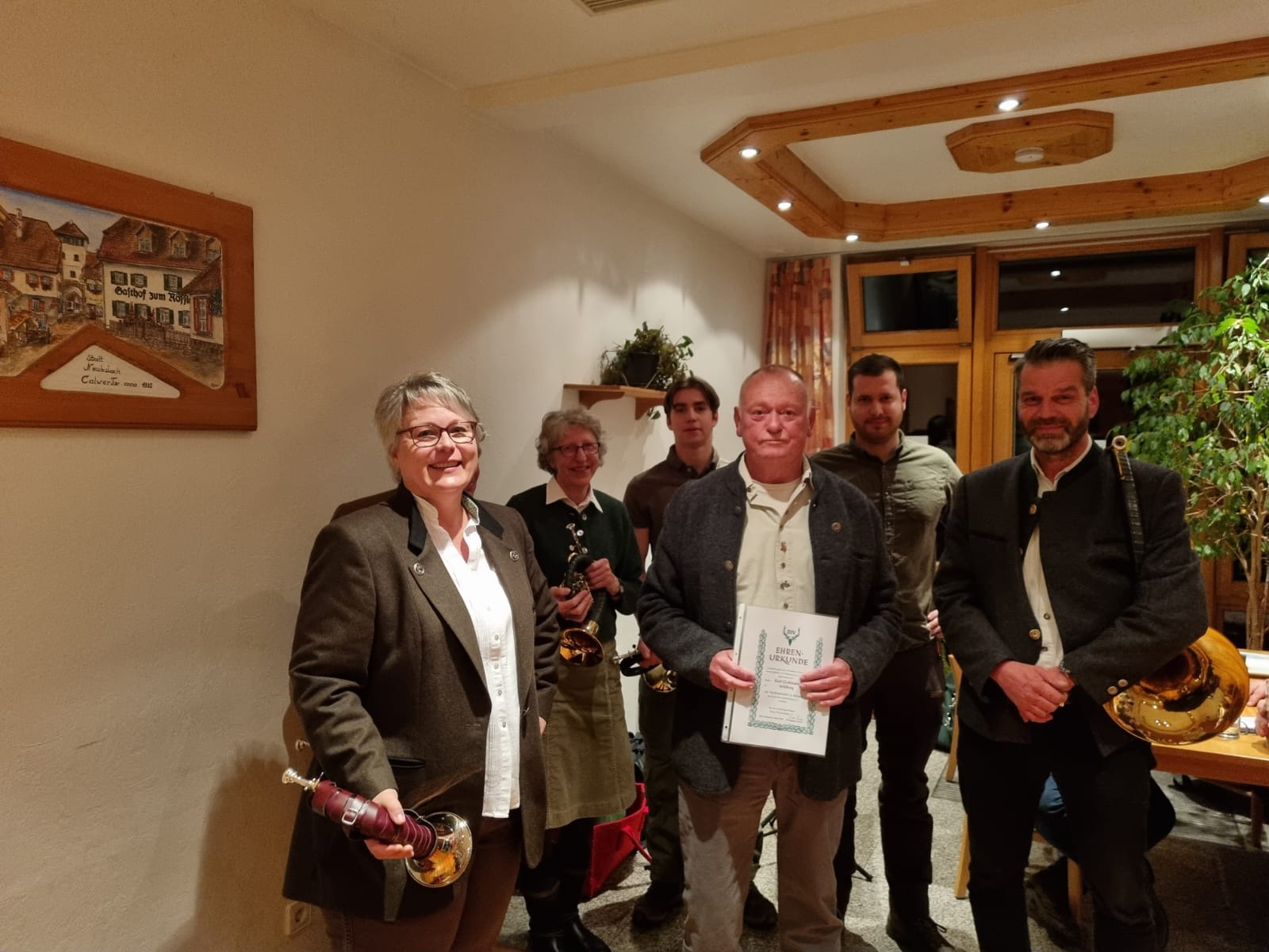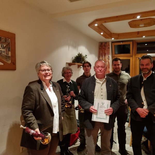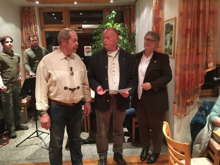 Thomas Gauder freute sich über die rege Beteiligung der Versammlung. Neben seinen Ausführungen berichtete KJM Elke Marko über Aktuelles aus der KJV und dem LJV, Peter Niethammer ergänzt den Abend mit interessanten Einblicken in seine Nachsuchen-Arbeit. Musikalisch umrahmt wurde der Abend von einer kleinen Besetzung der Bläsergruppe Frauenwald, unterstützt von Bläserobmann und Stellv. KJM Michael Neugebauer.