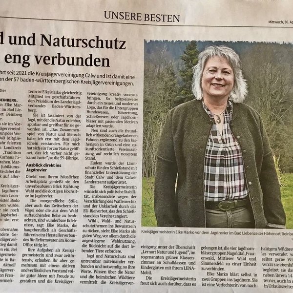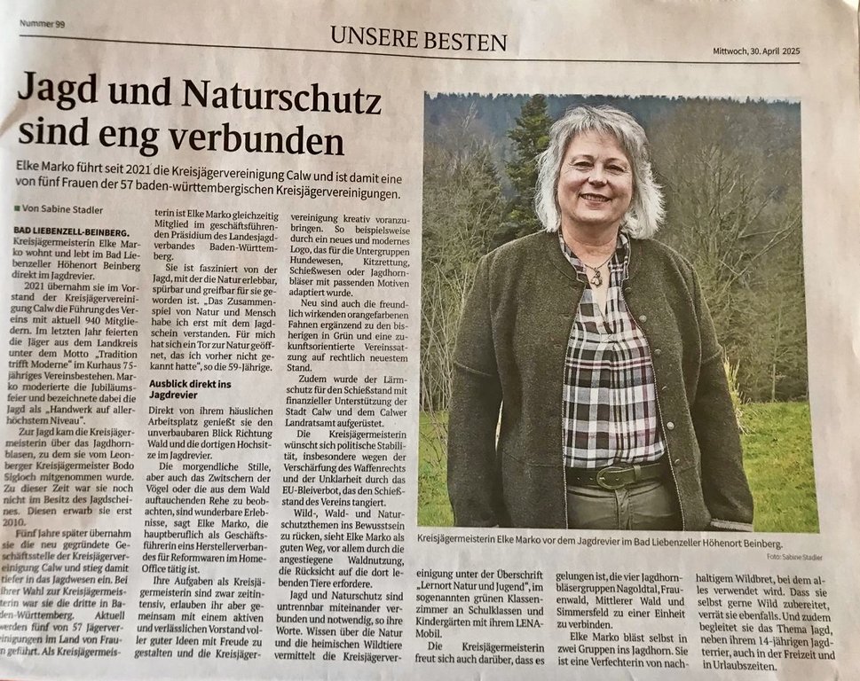 In seiner Ausgabe vom 30.04.2025 berichtet der Schwarzwälder Bote über die Arbeit von Kreisjägermeisterin Marko und gibt Einblick in ihre Tätigkeiten (den vollständigen Artikel finden Sie rechts bei “Bildergalerie”).