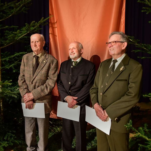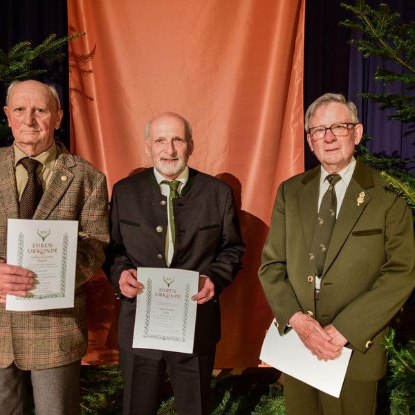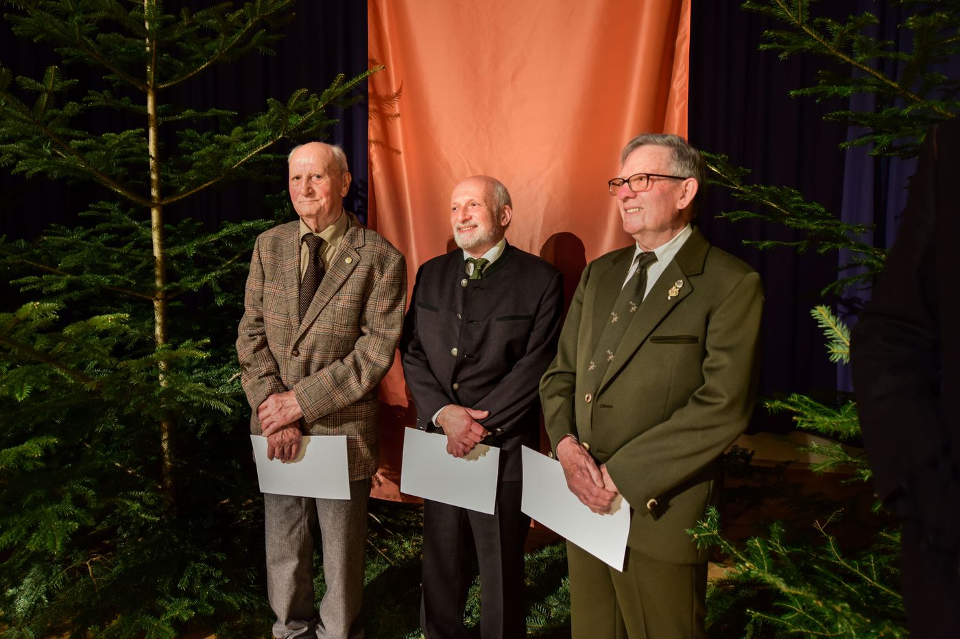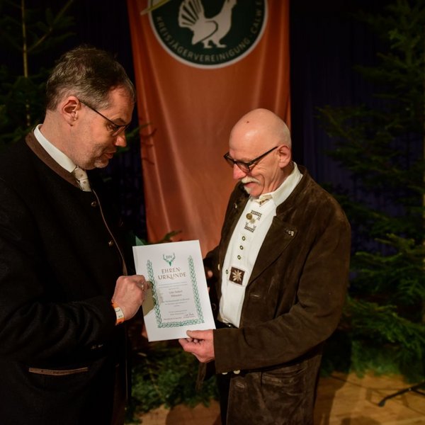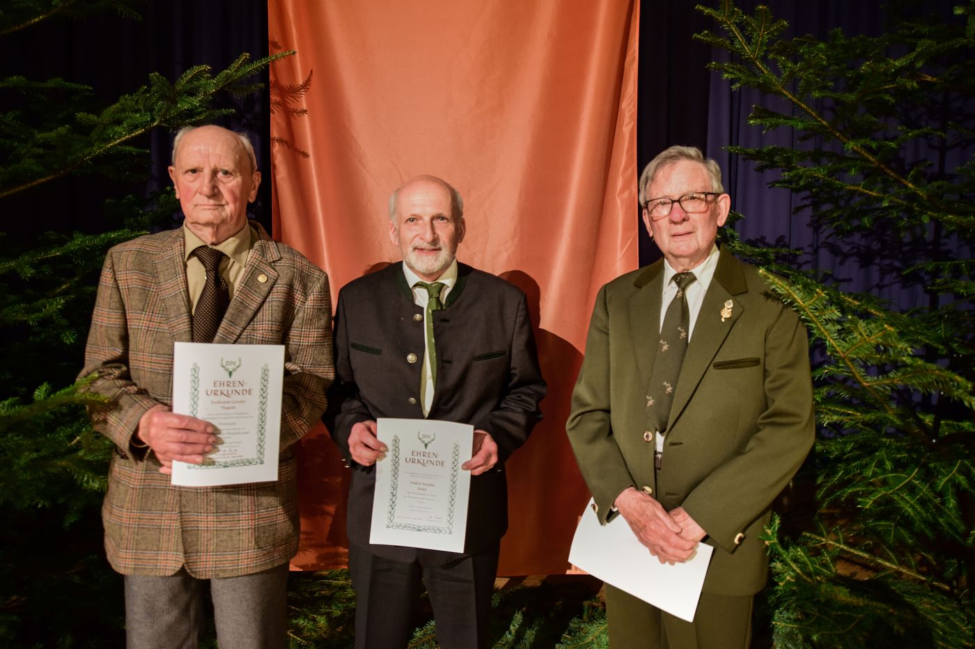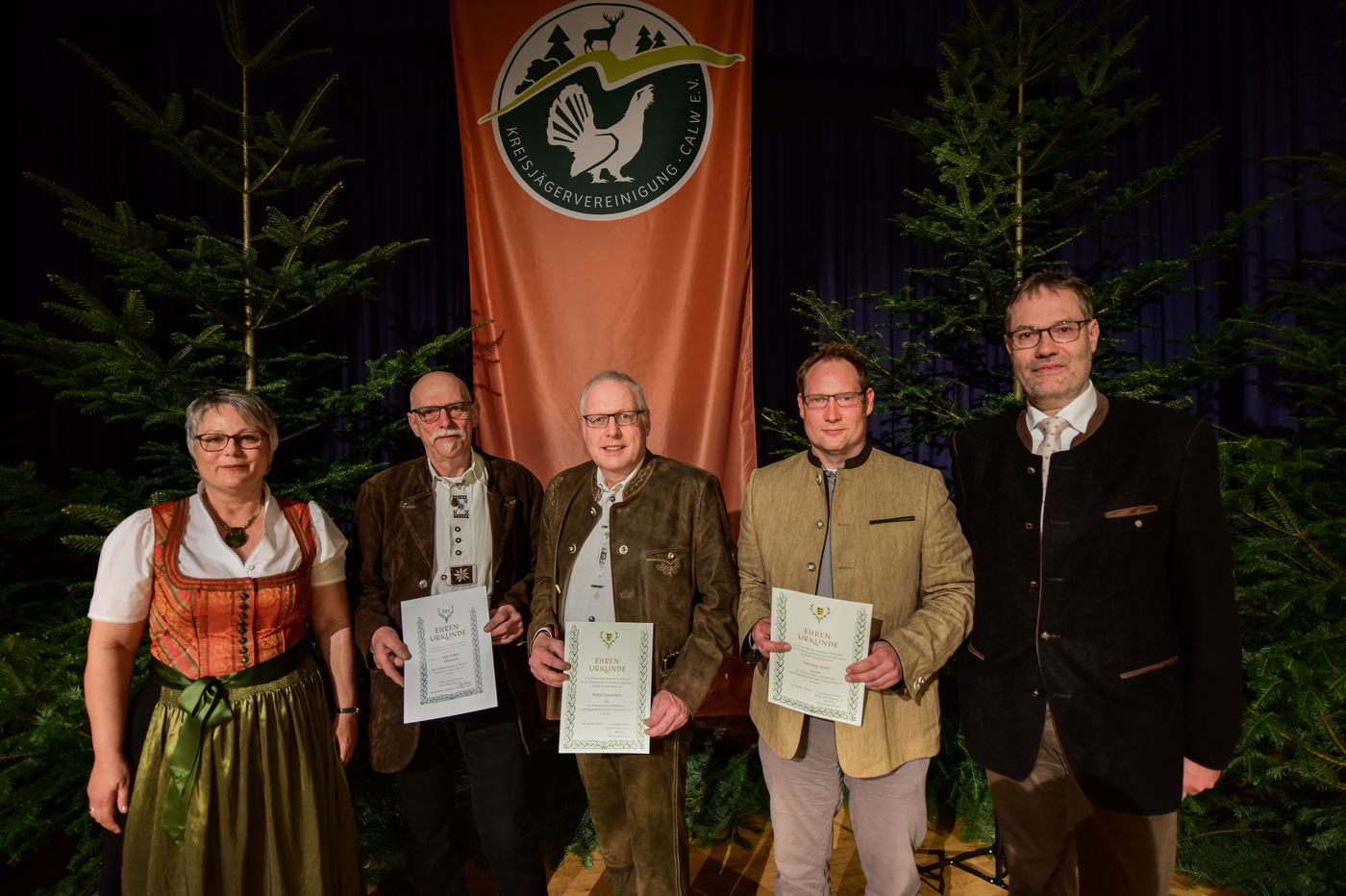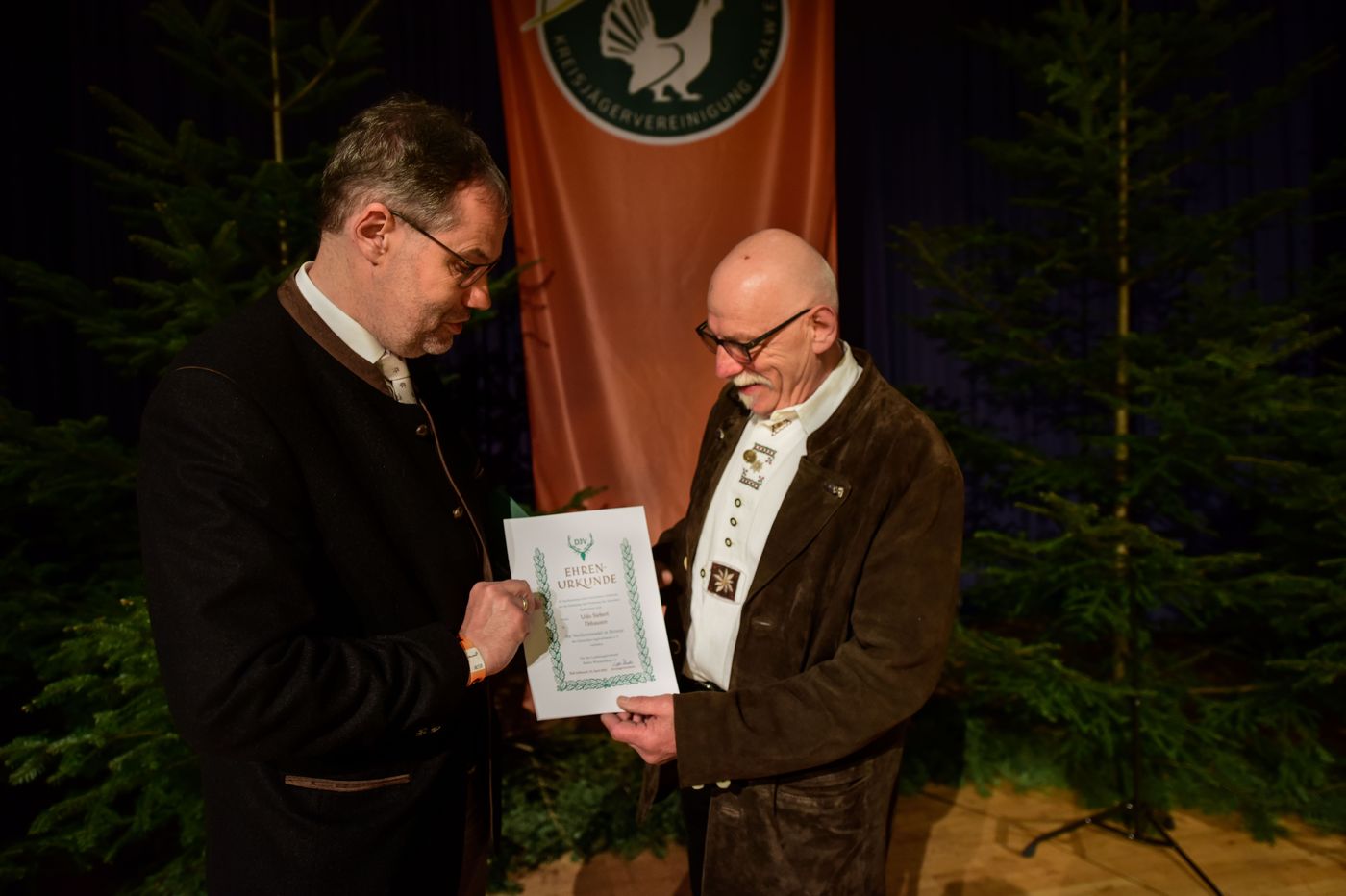 Zahlreiche verdiente Mitglieder erhielten ihre Ehrenurkunde, darunter Ferdinand Geissler (Nagold) und Gerhard Blaich (Altensteig) für die 65-jährige lange Treue zu ihrer Kreisjägervereinigung Calw.