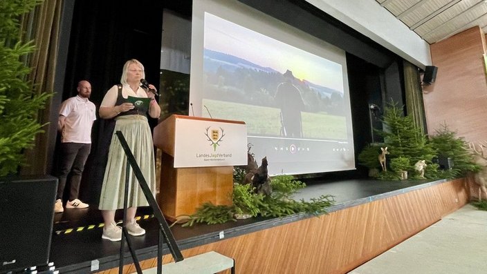 Im anschließenden, internen Teil stellte Kreisjägermeisterin Elke Marko den Delegierten den Landkreis Calw als gastgebende Jägervereinigung vor, gab einen Einblick in die Besonderheiten hinsichtlich Landschaft und Wild, welches sich auch in unserem Logo wiederspiegelt. Unser Jubiläumsfilm zum 75. Geburtstag im vergangenen Jahr rundete die Vorstellung ab.