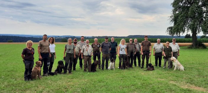 Am 26.04.2024 startete der diesjährige Hundeführerlehrgang unter der Leitung des Obmanns für Hundewesen Thomas Gauder mit Unterstützung von Dr. Peter Stahl und Maik Bernhardt. 15 Hundeführer/-innen übten jeden Freitag in Liebelsberg mit ihren Hunden unterschiedlichster Rasse die Leinenführigkeit, das Ablegen, die Schussfestigkeit, Schweißarbeit, sowie den Apport. Regelmäßige Übungseinheiten zwischen den Kurstagen festigen das Gelernte, um die jagdliche Brauchbarkeit in der Prüfung zu erreichen. Am 27.07.2024 traten 11 Gespanne zur Prüfung an. Von diesen waren zwei Gespanne aus dem Vorjahreskurs dabei. Insgesamt legten acht Hundeführer/-innen mit ihren Hunden die Prüfung erfolgreich ab. Drei Gespanne kamen leider auf der Schweißfährte nicht ans Stück und erfüllten so leider nicht die Prüfungsanforderungen. Tagesbester Hund im Modul 1.1 wurde der Deutsch Drahthaar Rüde Arik mit seiner Führerin Elke Prinz. Bester Hund der Module 1.1 & 1.2 wurde Hündin Summit (CBR - Chesapeake Bay Retriever) unter der Führung von Rena Abendschön. Wir gratulieren den Gespannen zu den erfolgreichen Leistungen!