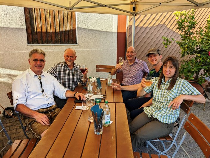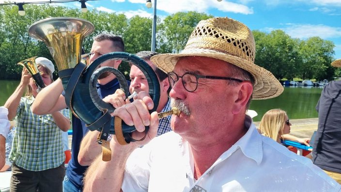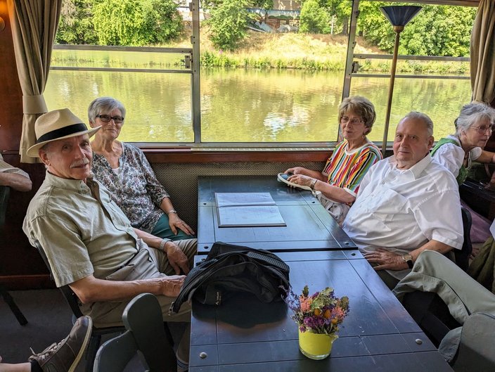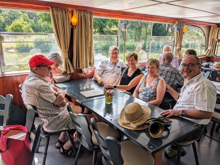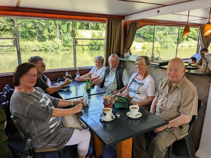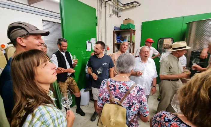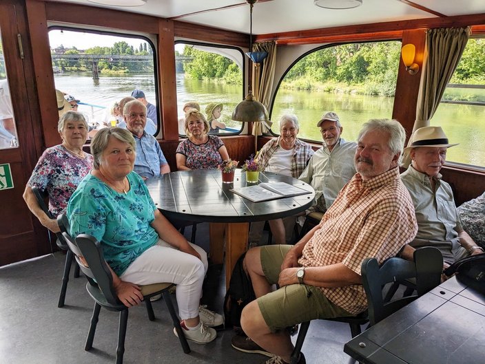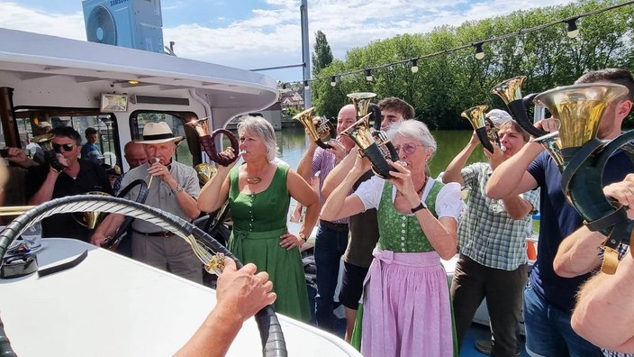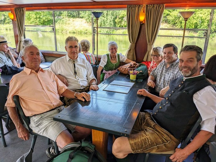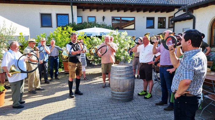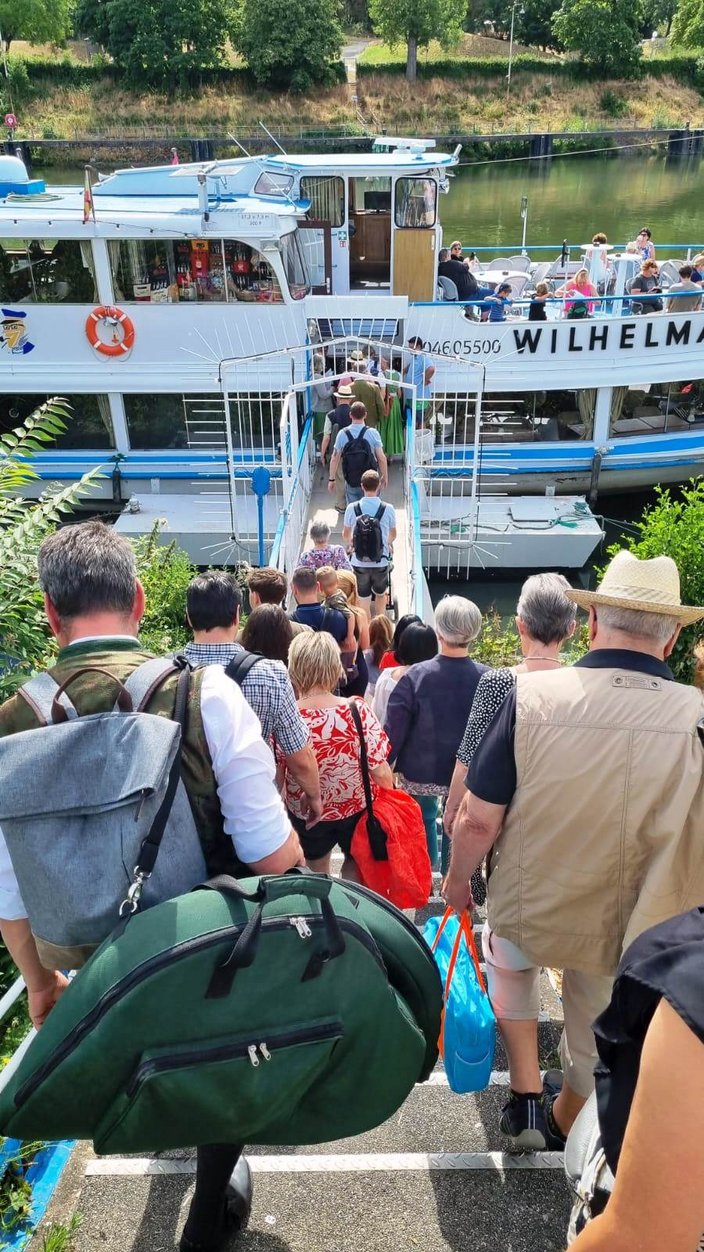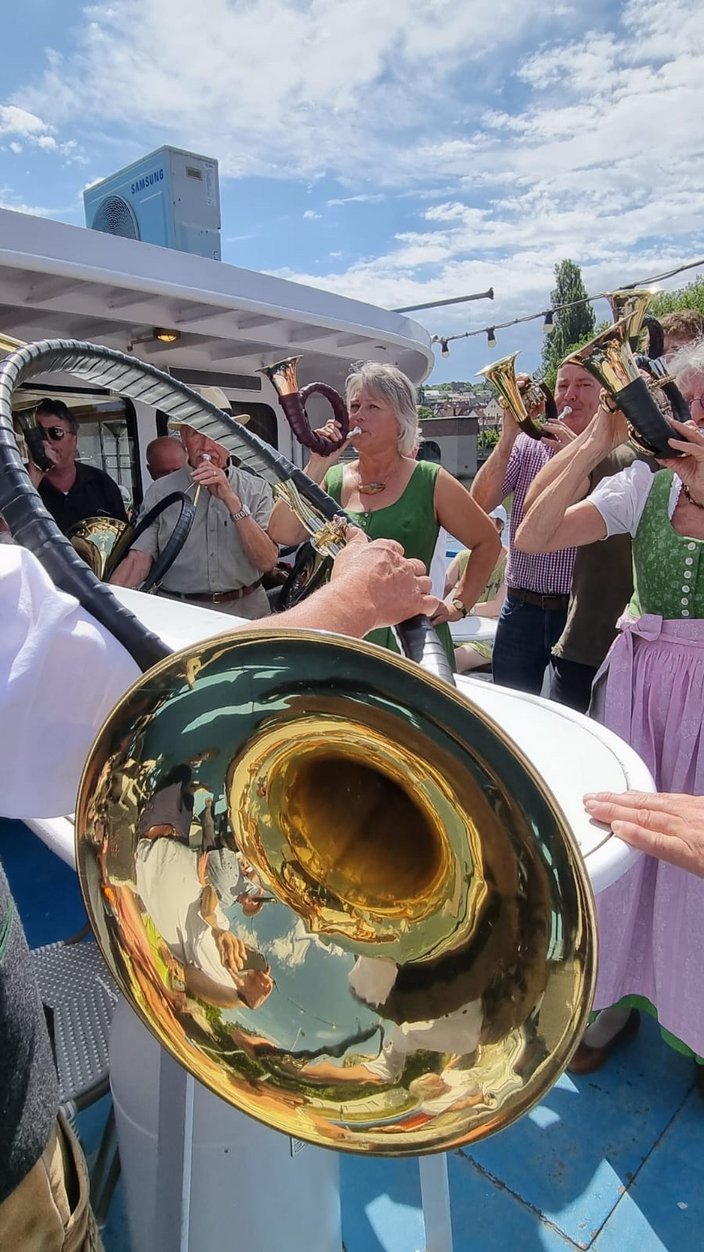 Mit dem Bus ging es nach Stuttgart an den Neckar und wir schipperten flussabwärts mit der „MS Wilhelma“ nach Marbach. Auf dem Schiff gab es standesgemäß eine musikalische Begrüßung aller Bläsergruppen. Von Marbach aus ging es mit dem Bus weiter auf die Burg Hohenbeilstein zur dort ansässigen Falknerei. Dort besuchten wir die Greivogelschau und lauschten den Ausführungen der Falkner zu den vorgeführten Raubvögeln. In Ilsfeld fand der Tag auf dem Weingut Golter einen kulinarischen Abschluss. Bei hochsommerlichen Temperaturen war die Weinprobe und Führung durch die Kelterei eine willkommene und vor allem erfrischende Abwechslung. Eine kleine Zeitreise durch 60 Jahre Jagdhornbläser Nagoldtal durfte natürlich auch nicht fehlen. Herzlichen Dank an unsere Organisatorin Nina von der Geschäftsstelle, unserem Busfahrer Matthias Probst und an alle Teilnehmerinnen und Teilnehmer, die diesen Ausflug zu einem besonderen Tag gemacht haben!