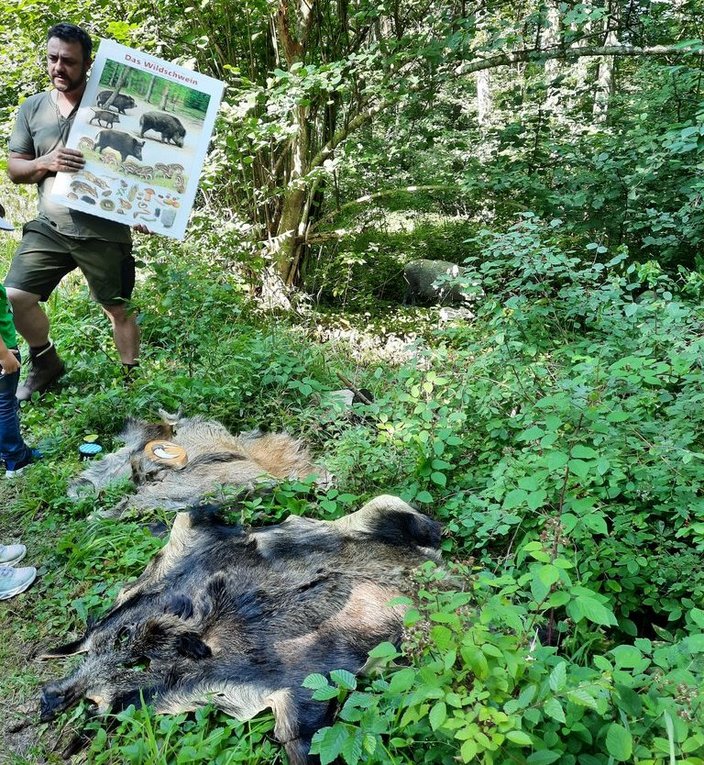 Bei den Adlerhorsttagen der evangelischen Kirchengemeinde Stammheim-Holzbronn war Familie Bernhardt am 25.07.2024 mit dem LeNa-Mobil der Kreisjägervereinigung Calw vor Ort. Auf einem Walderlebnispfad lernten die Kinder und ihre Familien einiges über unser heimisches Wild. Die mitgebrachten Felle wurden ausgiebig gestreichelt, die Lebensräume und Essgewohnheiten der Tiere erläutert. Fuchs und Dachs teilen sich einen Bau, Reh und Hirsch sind zwei verschiedenen Familien, die Ohren der Wildschweine heißen Teller usw. - bei diesem Rundgang wurde einiges geboten. Die drei kleinen Münsterländer Moses (12,5 Jahre), Cliff (7 Jahre) und der kleine Jakob (13 Wochen) sorgten für Entzücken, wurden von den Kindern gut behütet und stolz an der Leine mitgeführt. Die Aufgaben der Jagdhunde wurden am Beispiel des Apportierens gezeigt: Kitzrettung, Nachsuchen, Wasserarbeit, Stöbern bei Drückjagden und vieles weitere – ganz schön vielseitige Aufgaben, die die Jagdbegleiter auf vier Beinen erfüllen. Das LeNa-Mobil mit allen Präparaten rundete das Programm ab. Zum Abschluss gab es für die Kinder schöne Buttons mit Tiermotiven.