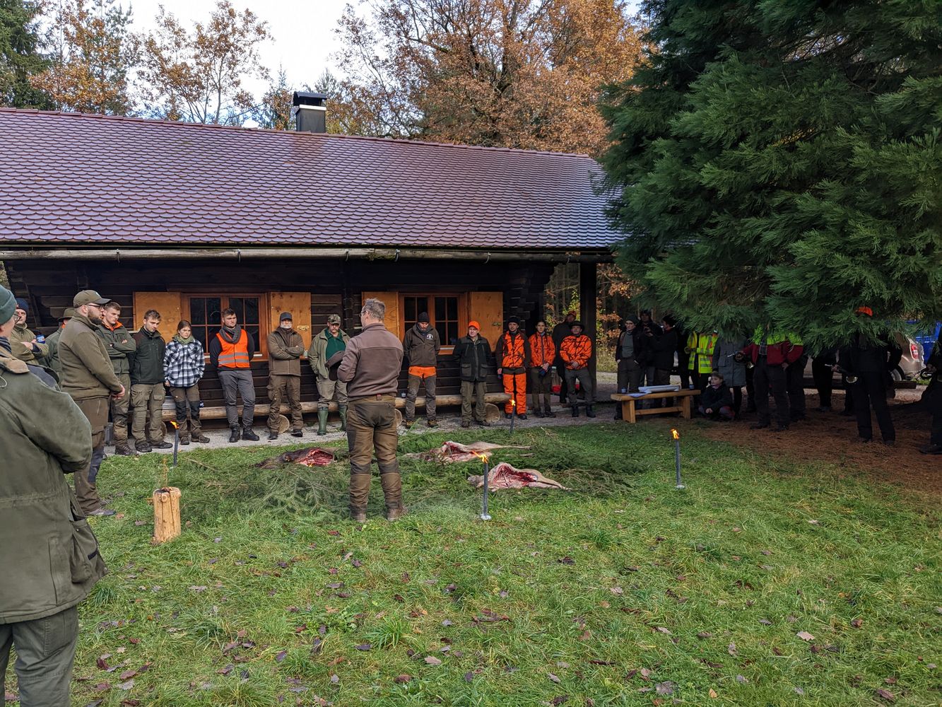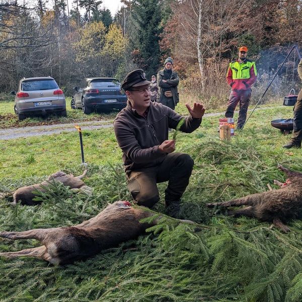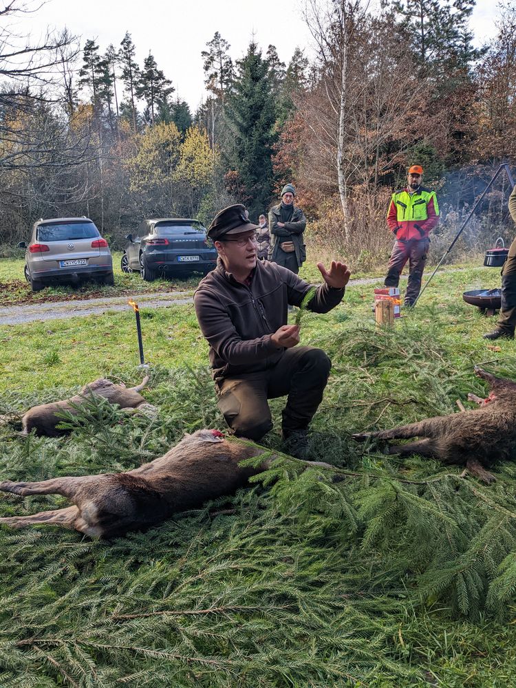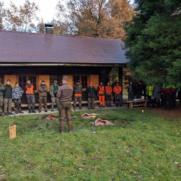 Der Aufwand hat sich gelohnt und wir hatten einen wunderschönen Jagdtag bei bestem Wetter. Die Kursteilnehmer haben sich ordentlich ins Zeug gelegt, um das Wild auf die Läufe zu bringen. Auch wenn die Strecke überschaubar war, konnten neben dem eigentlichen Jagdbetrieb beim Aufbrechen wichtige Erfahrungen gesammelt werden. Unter Aufsicht wurde fachmännisch aufgebrochen, Organe beschaut und bewertet und erste Kenntnisse in der Bedeutung der Wildbrethygiene gewonnen. Brauchtum und jagdliche Traditionen kamen an diesem Tag natürlich auch nicht zu kurz.